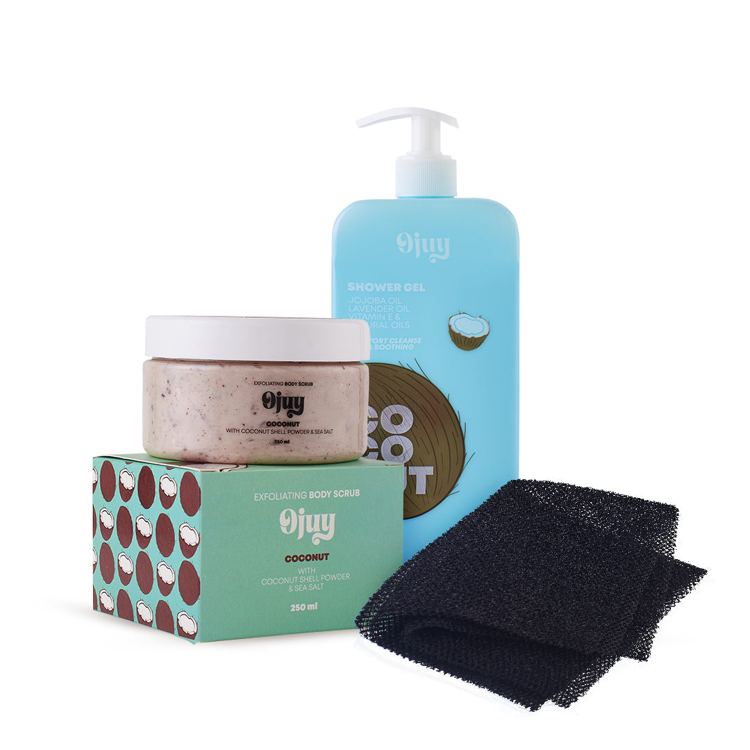 Bundle includes:Coconut Shower Gel - 850 mlCoconut Body Scrub - 250 mlBlack Exfoliating Towel